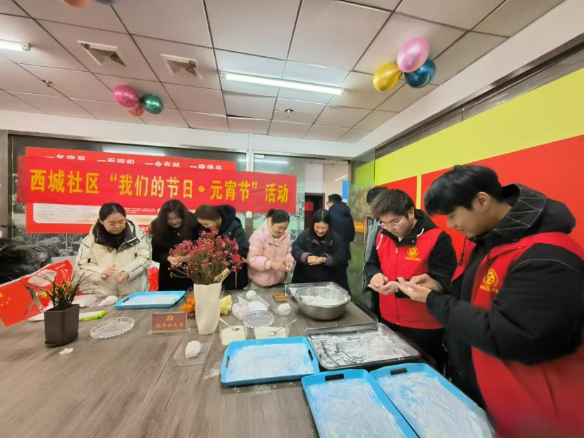 最后团队来到未来城社区活动室。活动室木桌被铺上一次性防油纸,三只陶瓷盆依次排开,一盆盛着雪白的糯米粉,一盆是泛着油光的黑芝麻糖馅,另一盆则是红豆沙混着细碎的桂花末。志愿者们戴好一次性手套,帮助社区一起包起了元宵,大家将每个元宵的重量严格控制在20克左右,确保大小均匀。
